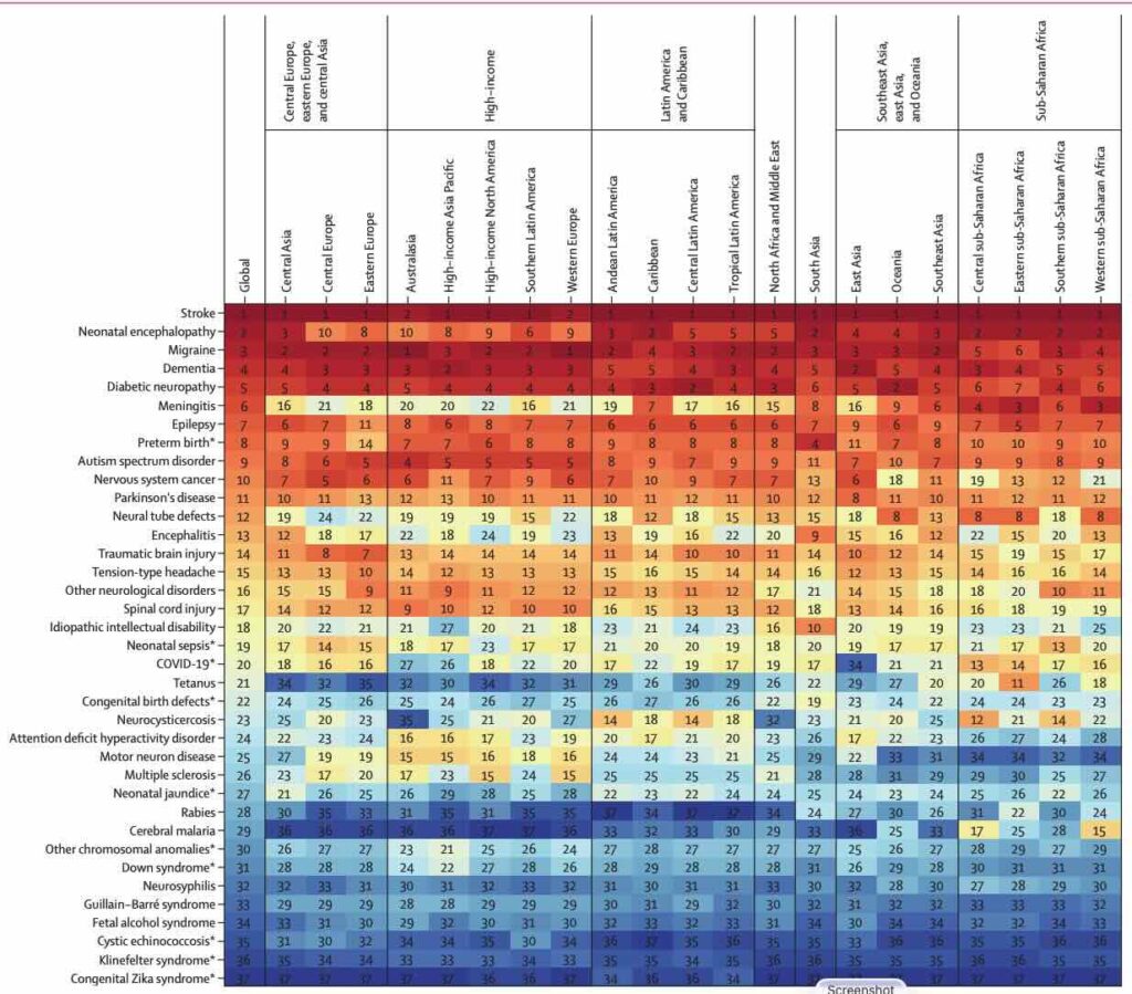 When we tried to measure the global burden of disease, the number one seems to be stroke it’s it’s true across many nations. The other higher ones are migraine dementia, and diabetic neuropathy as might be expected, but surprisingly some of the nervous system cancers are much lower perhaps because neuron is a non-dividing cell. With all the treatment options available, it is surprising that neonatal sepsis continues to be on the charts.